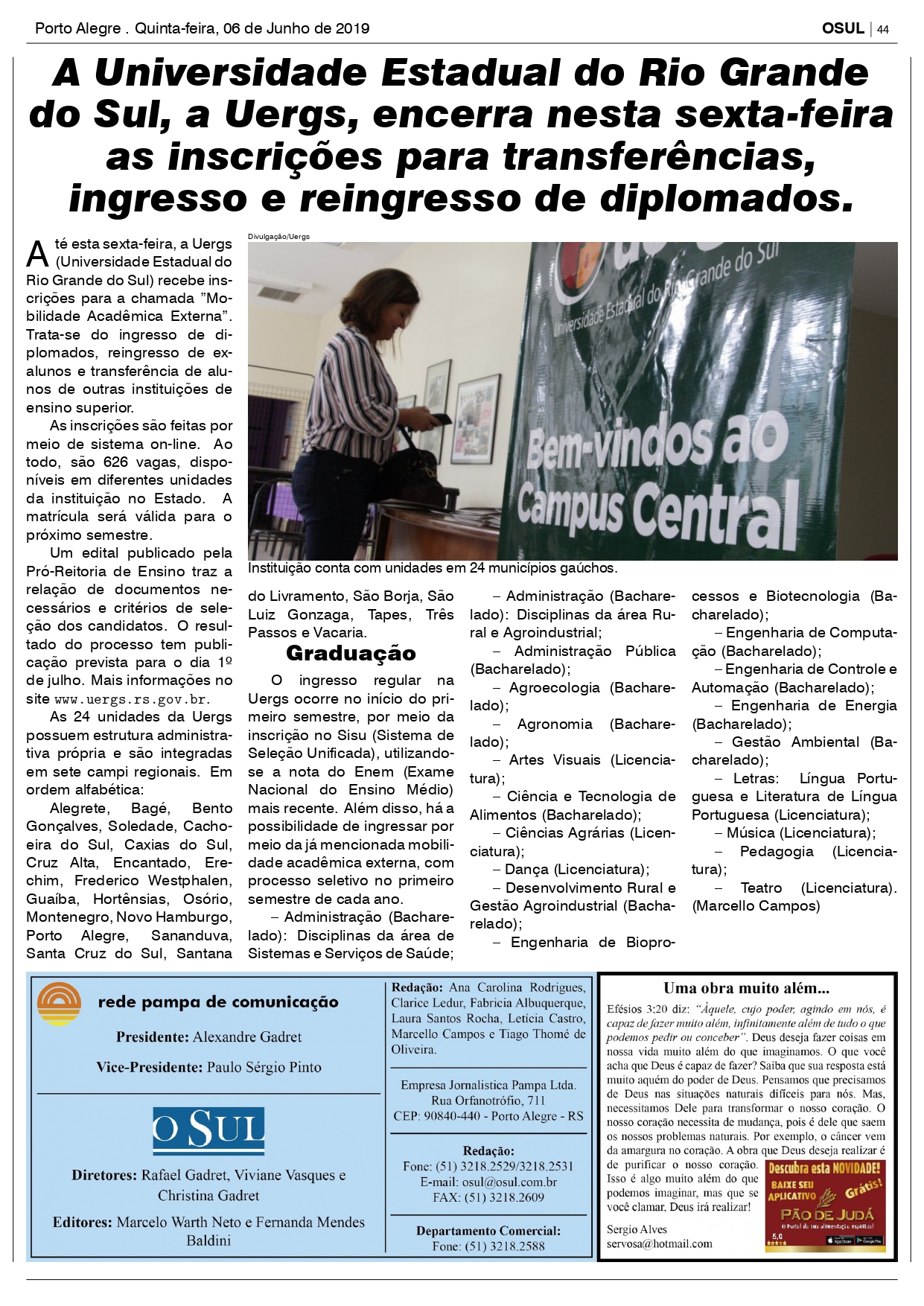 A Universidade Estadual do Rio Grande do Sul, a Uergs, encerra nesta sexta-feira as inscrições para transferências, ingresso e reingresso de diplomados -