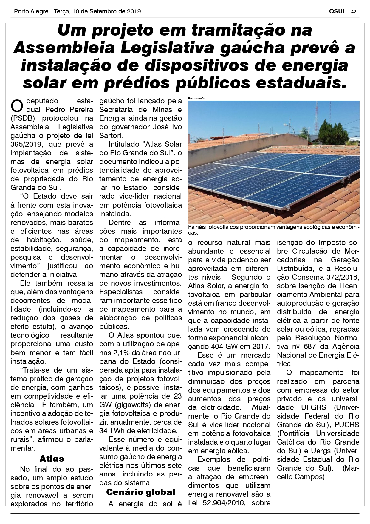 Um projeto em tramitação na Assembleia Legislativa gaúcha prevê a instalação de dispositivos de energia solar em prédios públicos estaduais -